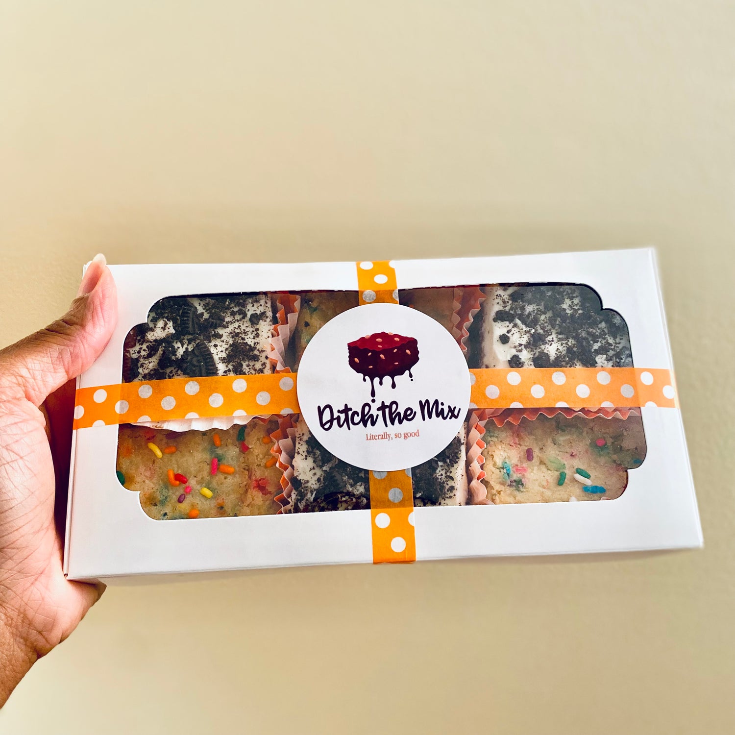Ditch the Mix brownies are packaged in a sealed, high-quality bakery box that looks like a gift. Our brownies come in boxes of 6 brownies (minimum) up to 12 brownies (maximum). Each brownie comes in an individual baking cup to preserve flavor. Our cookies also come in a sealed, high-quality bakery box and can be ordered by the dozen.